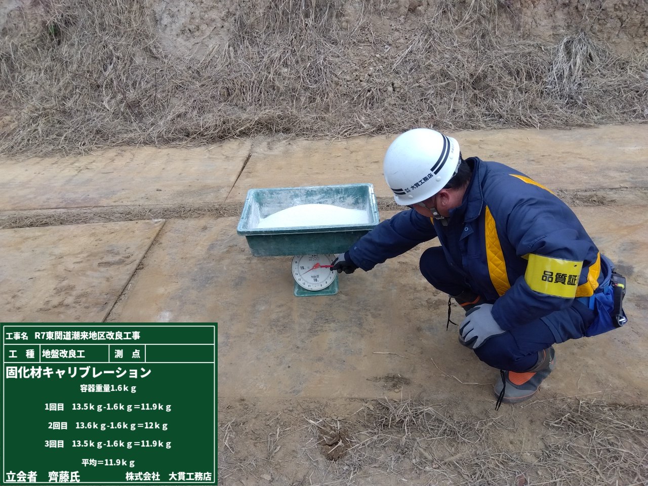 固化材の機械設定重量(理論値)と実測重量(実測値)の平均値から、固化材の修正係数を制御盤に入力します!