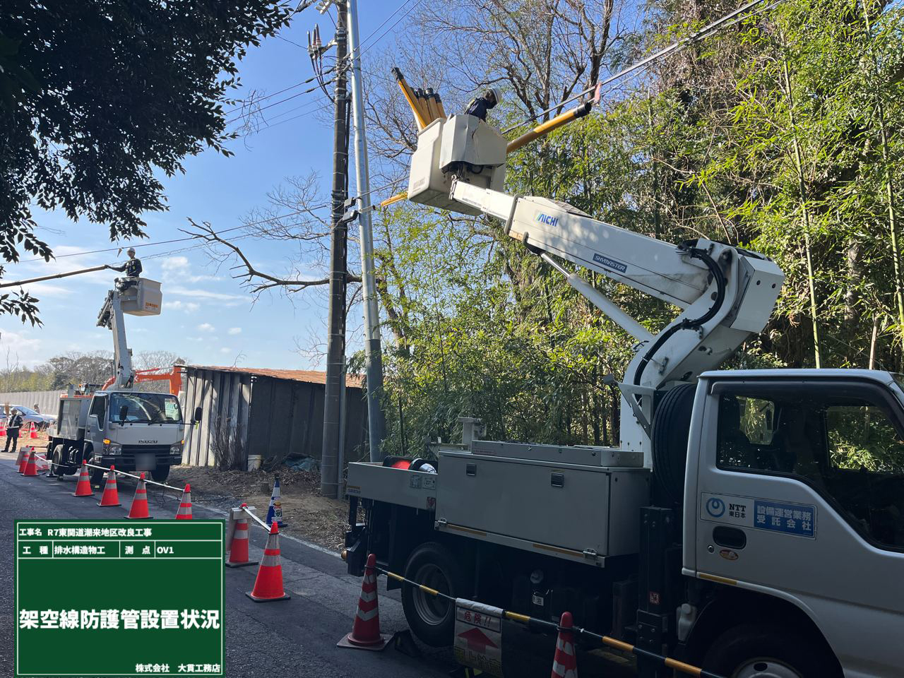 高所作業車の脇には、高架線保護保護管がさっそく活躍していますね✨