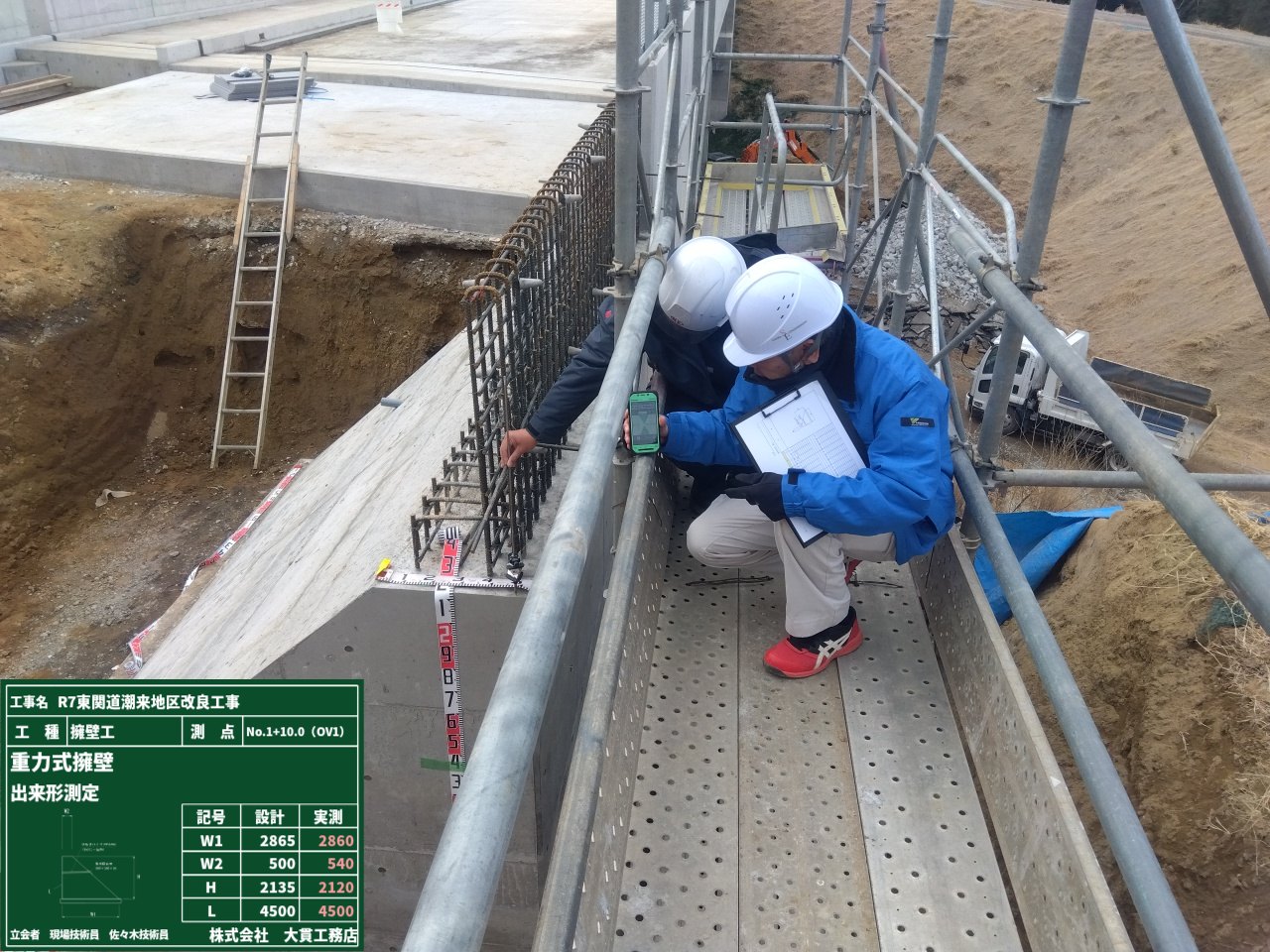 重力式擁壁のコンクリート打設後、工事はどんどん進み出来形測定に入ります。